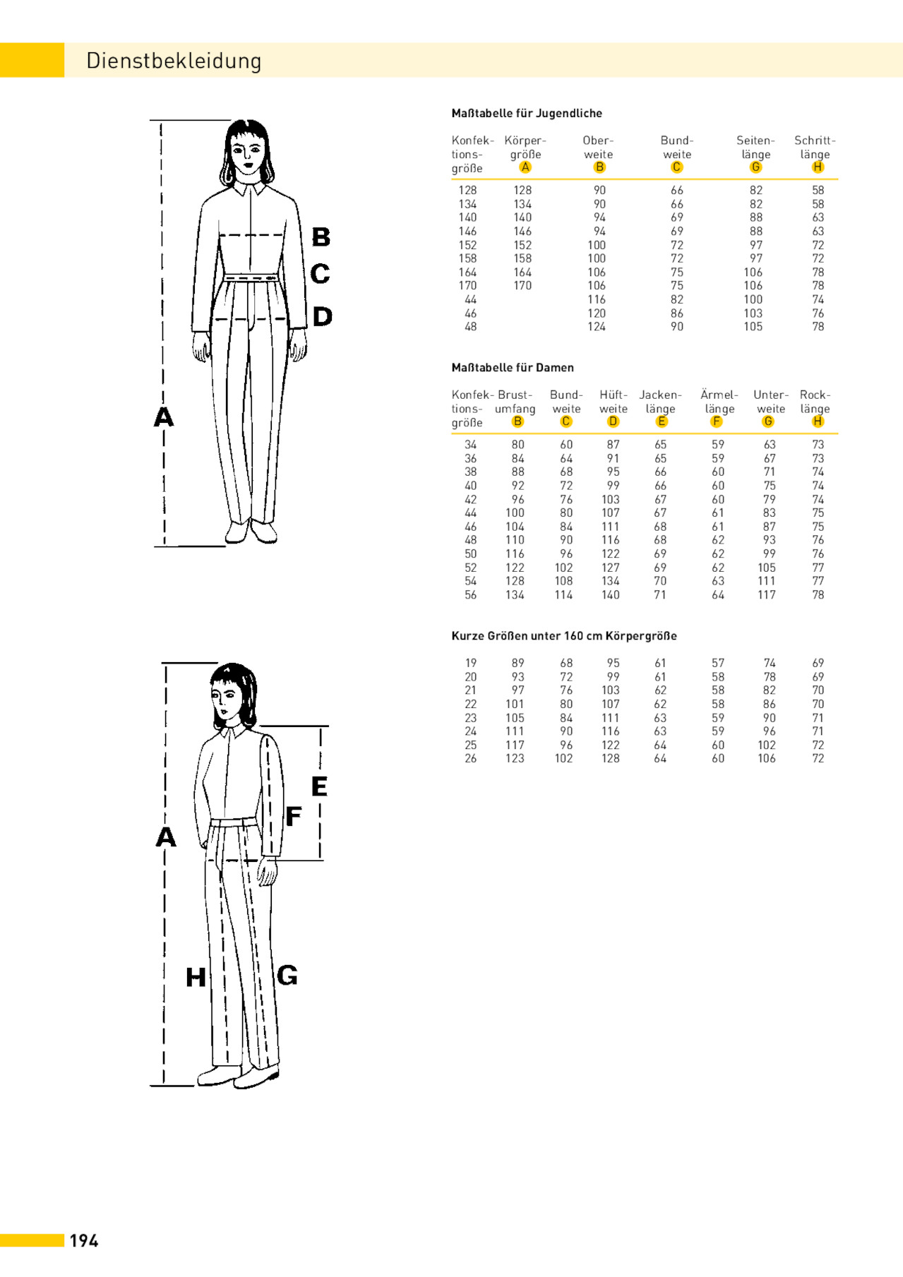 INHALT: Dienstbekleidung Maßtabelle für Jugendliche Konfek- Körper- tions- größe größe A 128 128 134 134 140 140 146 146 152 152 158 158 164 164 170 170 44 46 48 Oberweite B 90 90 94 94 100 100 106 106 116 120 124 Bundweite C 66 66 69 69 72 72 75 75 82 86 90 Seitenlänge G 82 82 88 88 97 97 106 106 100 103 105 Schrittlänge H 58 58 63 63 72 72 78 78 74 76 78 Maßtabelle für Damen Konfek- Brust- tions- umfang größe B 34 80 36 84 38 88 40 92 42 96 44 100 46 104 48 110 50 116 52 122 54 128 56 134 Bundweite C 60 64 68 72 76 80 84 90 96 102 108 114 Hüft- Jackenweite länge DE 87 65 91 65 95 66 99 66 103 67 107 67 111 68 116 68 122 69 127 69 134 70 140 71 Ärmel- Unter- Rock- länge weite länge F GH 59 63 59 67 60 71 60 75 60 79 61 83 61 87 62 93 62 99 62 105 63 111 64 117 73 73 74 74 74 75 75 76 76 77 77 78 Kurze Größen unter 160 cm Körpergröße 19 89 68 95 20 93 72 99 21 97 76 103 22 101 80 107 23 105 84 111 24 111 90 116 25 117 96 122 26 123 102 128 61 61 62 62 63 63 64 64 57 74 58 78 58 82 58 86 59 90 59 96 60 102 60 106 69 69 70 70 71 71 72 72 194