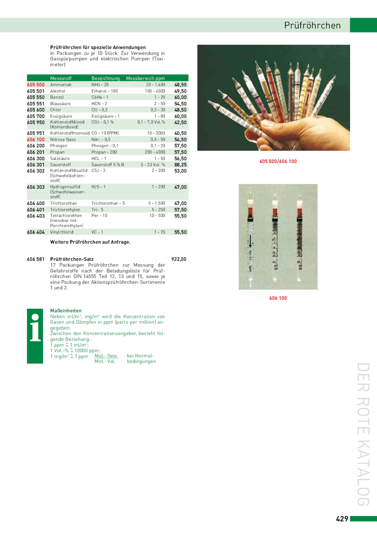 INHALT: Prüfröhrchen für spezielle Anwendungen in Packungen zu je 10 Stück. Zur Verwendung in Gasspürpumpen und elektrischen Pumpen (Toximeter) 605 500 605 501 605 550 605 551 605 600 605 700 605 950 605 951 606 100 606 200 606 201 606 300 606 301 606 302 606 303 606 400 606 401 606 403 606 404 Messstoff Bezeichnung Messbereich ppm Ammoniak NH3 - 20 20 - 1.400 Alkohol Ethanol - 100 100 - 6000 Benzol C6H6 - 1 1 - 25 Blausäure HCN - 2 2 - 50 Chlor CI2 - 0,2 0,2 - 30 Essigsäure Essigsäure - 1 1 - 80 Kohlenstoffdioxid CO2 - 0,1 % (Kohlendioxid) 0,1 - 7,0 Vol.% Kohlenstoffmonoxid CO - 10 (PPM) 10 - 3000 Nitrose Gase Nitr. - 0,5 0,5 - 50 Phosgen Phosgen - 0,1 0,1 - 20 Propan Propan - 200 200 - 4000 Salzsäure HCL - 1 1 - 50 Sauerstoff Sauerstoff 5 % B 5 - 23 Vol. % Kohlenstoffdisulfid CS2 - 2 (Schwefelkohlenstoff) 2 - 300 Hydrogensulfid H2S - 1 (Schwefelwasser- stoff) 1 - 200 Trichlorethan Trichlorethan - 5 5 - 1.500 Trichlorethylen Tri- 5 5 - 250 Tetrachlorethen (messbar mit Perchlorethylen) Per - 10 10 - 500 Vinylchlorid VC - 1 1 - 70 Weitere Prüfröhrchen auf Anfrage. 48,50 49,50 60,00 54,50 48,50 60,00 42,50 40,50 54,50 57,50 57,50 56,50 88,25 53,00 47,00 47,00 57,50 55,50 55,50 606 581 Prüfröhrchen-Satz 17 Packungen Prüfröhrchen zur Messung der Gefahrstoffe nach der Beladungsliste für Prüfröhrchen DIN 14555 Teil 12, 13 und 15, sowie je eine Packung der Aktionsprüfröhrchen-Sortimente 1 und 2. 922,00 i Maßeinheiten Neben ml/m3, mg/m3 wird die Konzentration von Gasen und Dämpfen in ppm (parts per million) an- gegeben. Zwischen den Konzentrationsangaben besteht fol- gende Beziehung: 1 ppm ^= 1 ml/m3; 1 Vol.-% ^= 10000 ppm; 1 mg/m3 ^= 1 ppm . Mol.- Gew. Mol.- Vol. bei Normalbedingungen Prüfröhrchen 605 500/606 100 606 100 DER ROTE KATALOG 429
